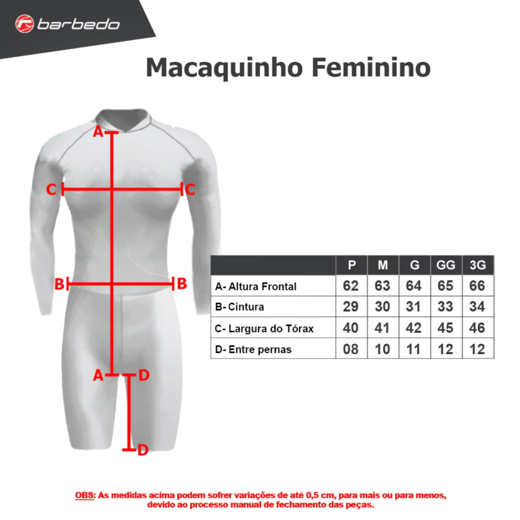 O Macaquinho de Ciclismo Feminino possui forro Barbedo Sprint Feminino, com tratamento antimicrobiano, zíper integral, três bolsos traseiros e Mangas em tecido Glare Dry®. Suas pernas possuem barras em elastano, sem elástico, para maior conforto.