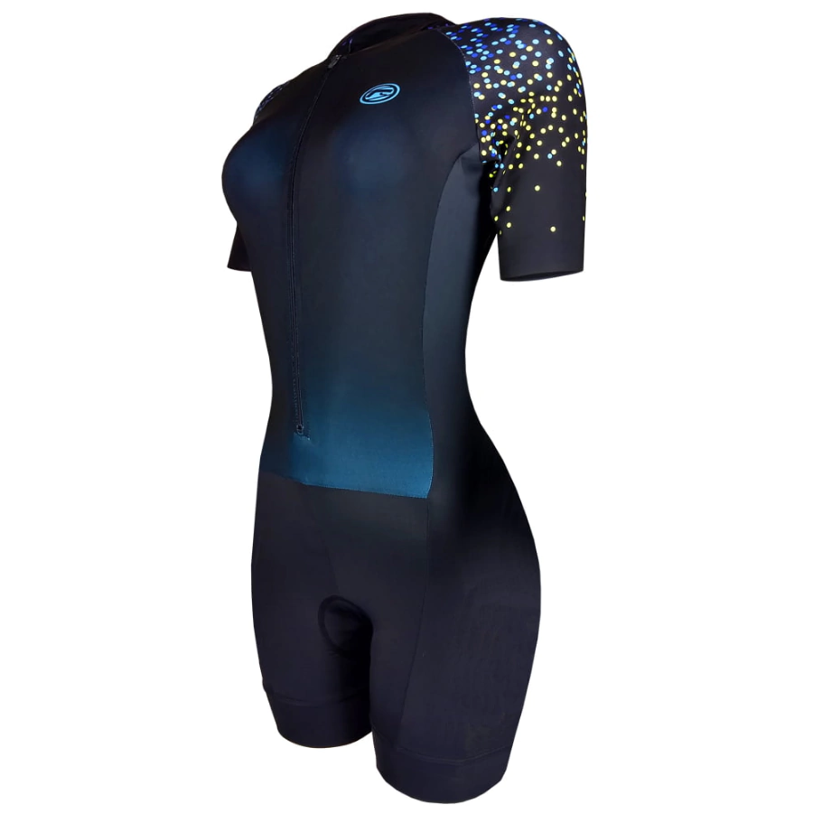 Macaquinho de Ciclismo Feminino Barbedo Via Láctea é confeccionado em tecido Bit-Dry® com proteção UV FPS 30, com uma composição de poliamida e elastano, que oferece boa resistência e flexibilidade. Além disso, sua modelagem anatômica, justa ao corpo, ajuda a diminuir o arrasto e, consequentemente, melhora a eficiência aerodinâmica e a performance do ciclista